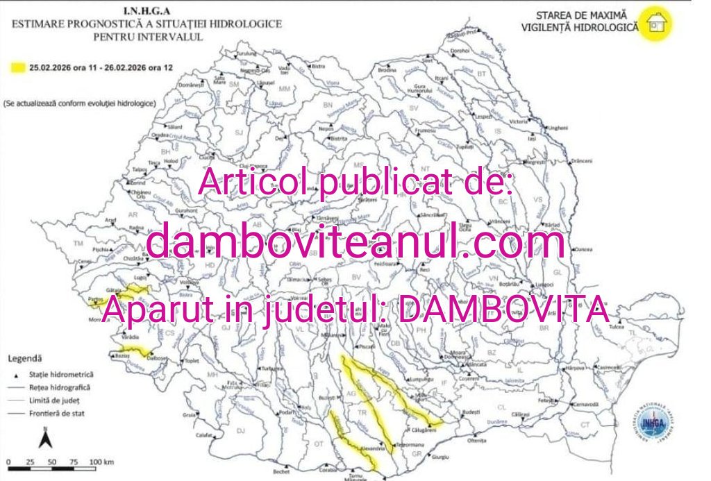 Institutul Național de Hidrologie și Gospodărire a Apelor a emis o nouă ATENȚIONARE HIDROLOGICĂ COD GALBEN pentru râul Argeș segmentul aflat în județul Dâmbovița – afluenții aferenți sectorului aval S.H. Malu Spart – amonte S.H. Budești, valabilă până la 26 februarie 2026, ora 12:00.