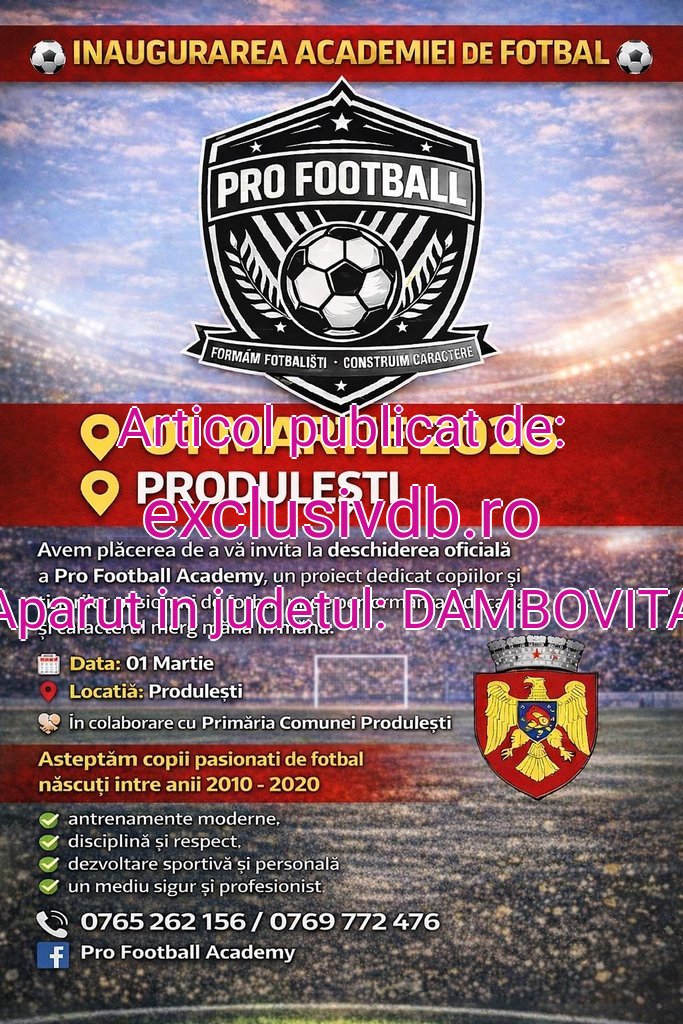 Sursa: https://exclusivdb.ro/prima-academie-de-fotbal-din-produlesti-va-fi-inaugurata-pe-1-martie-2026-un-proiect-dedicat-copiilor-si-viitorului-sportiv-al-comunei/