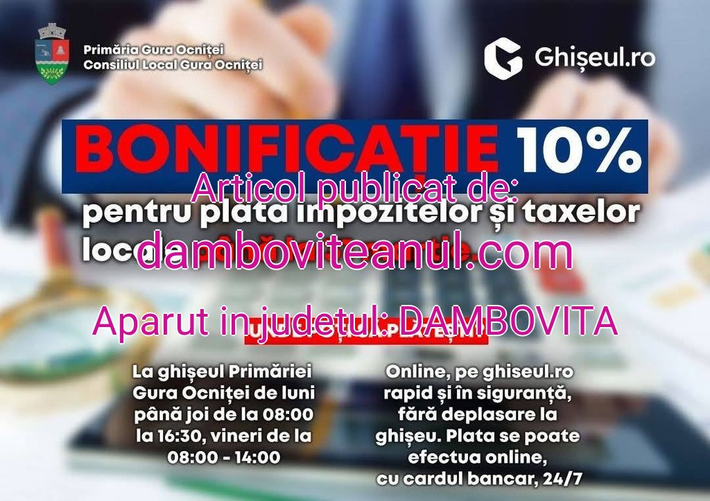 Primăria comunei Gura Ocniței reamintește contribuabililor că plata integrală a impozitelor și taxelor locale aduce, și în acest an, o bonificație de 10%. Anunțul a fost făcut de primarul Liviu Vasilescu, care îi încurajează pe cetățeni să își achite din timp obligațiile fiscale.Plata poate fi efectuată direct la sediul Primăriei Gura Ocniței, la Compartimentul Taxe și Impozite, de luni până joi, între orele 08.00 și 16.30, respectiv vineri, între 08.00 și 14.00. Pentru a facilita accesul cetățenilor din satele aparținătoare, încasările se fac și în teritoriu, în fiecare zi de marți, între orele 09.00 și 13.00, la Căminul Cultural din Adânca, și în fiecare miercuri, în același interval orar, la Biblioteca din Săcueni.