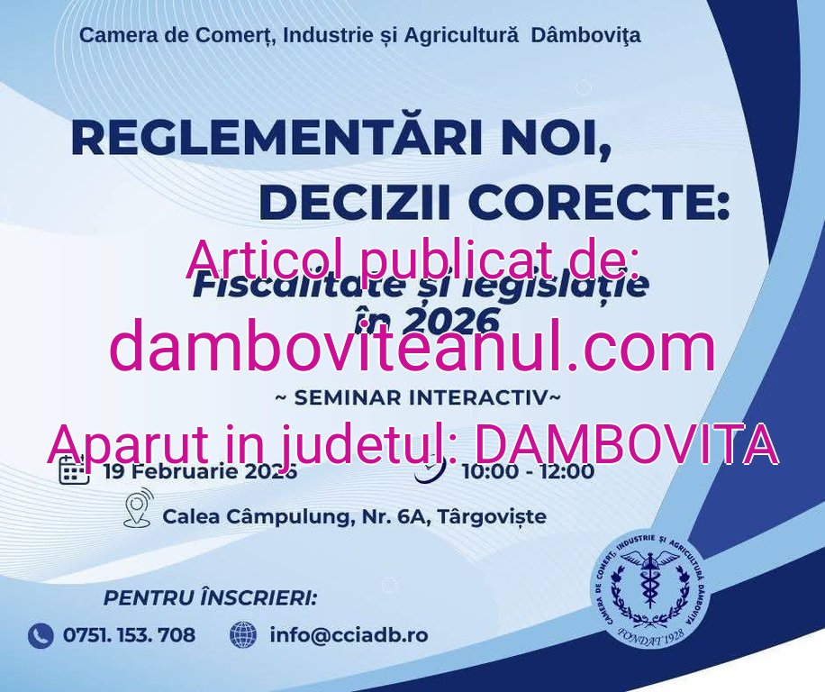 Seminarul se adresează antreprenorilor, managerilor și specialiștilor care doresc să își desfășoare activitatea în condiții de conformitate legală și predictibilitate fiscală.Evenimentul va avea loc în data de 19 februarie 2026, în intervalul orar 10:00–12:00, la sediul Camerei de Comerț Dâmbovița, situat pe Calea Câmpulung nr. 6A, în municipiul Târgoviște.